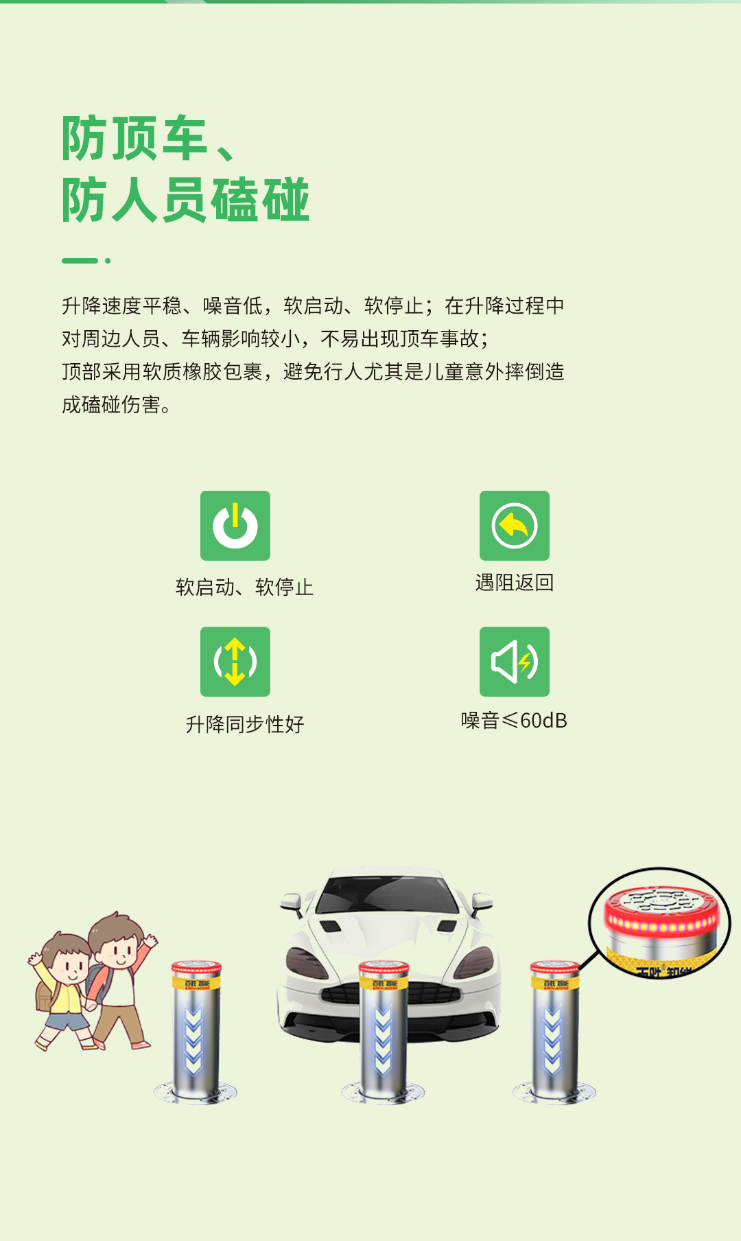 升降速度平穩(wěn)、噪音低,軟啟動、軟停止;在升降過程中對周邊人員、車輛影響較小,不易出現(xiàn)頂車事故;頂部采用軟質(zhì)橡膠包裹,避免行人尤其是兒童意外摔倒造成磕碰傷害。