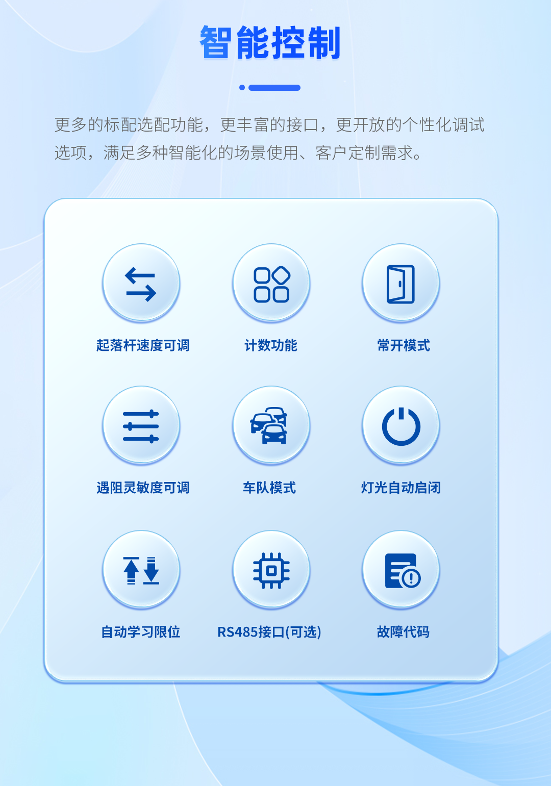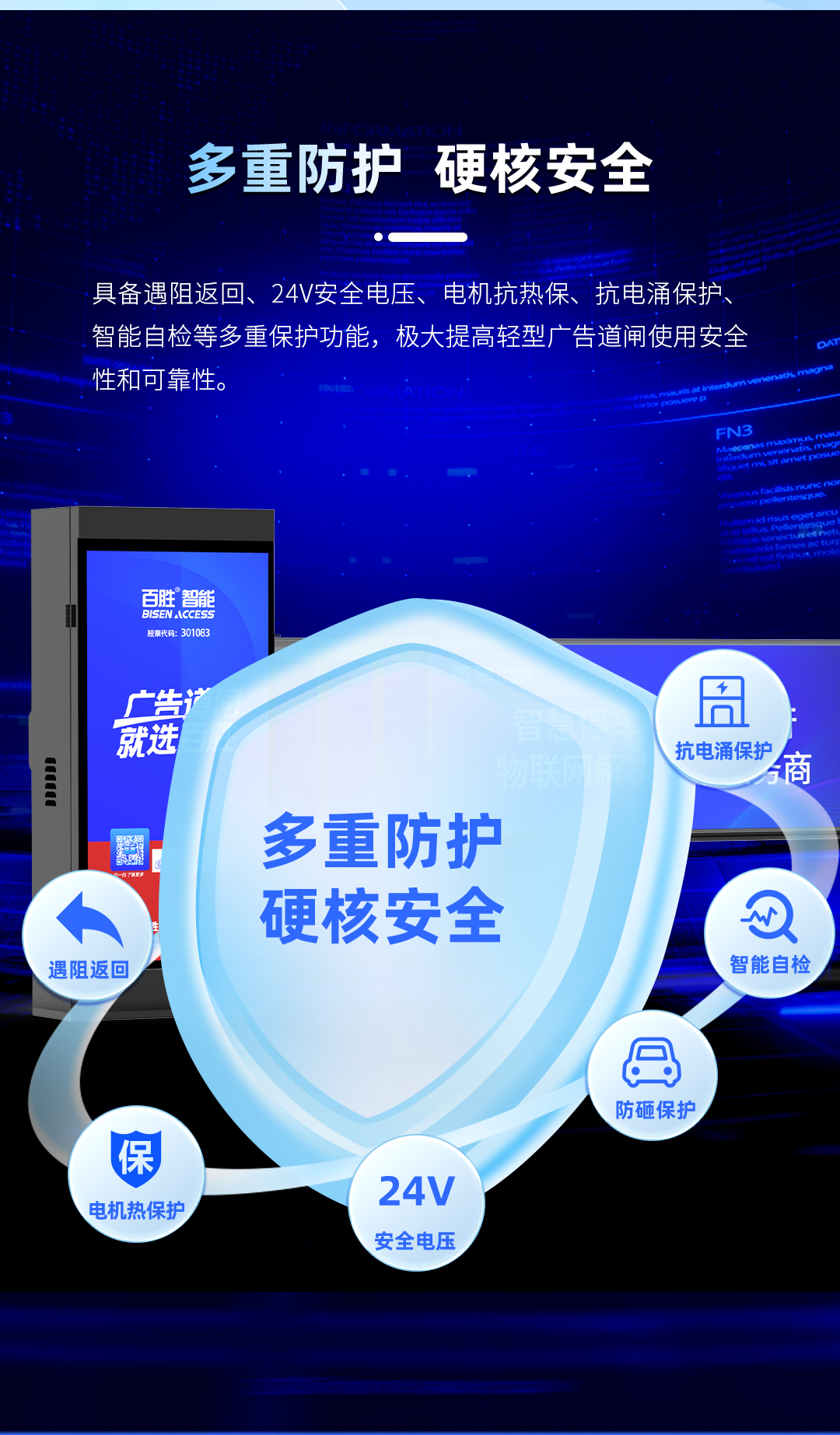 具備遇阻返回、24V安全電壓、電機抗熱保、抗電涌保護(hù)智能自檢等多重保護(hù)功能,極大提高輕型廣告道閘使用安全性和可靠性。