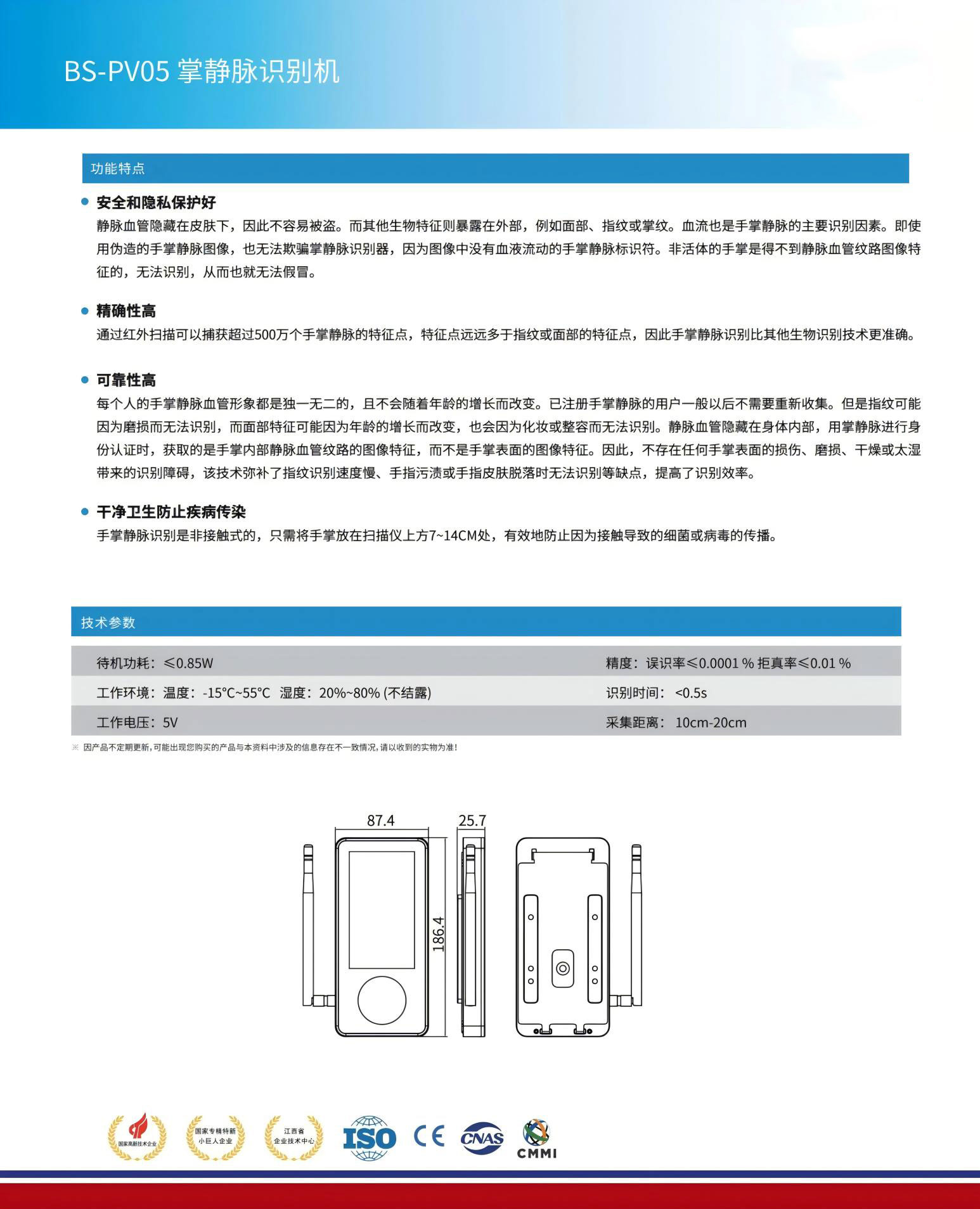 每個人的手掌靜脈血管形象都是獨(dú)一無二的,且不會隨著年齡的增長而改變。已注冊手掌靜脈的用戶一般以后不需要重新收集。但是指紋可能因?yàn)槟p而無法識別,而面部特征可能因?yàn)槟挲g的增長而改變,也會因?yàn)榛瘖y或整容而無法識別。靜脈血管隱藏在身體部,用掌靜脈進(jìn)行身份認(rèn)證時,獲取的是手掌內(nèi)部靜脈血管紋路的圖像特征,而不是手掌表面的圖像特征。因此,不存在任何手掌表面的損傷、磨損、干燥或太濕帶來的識別障礙,該技術(shù)彌補(bǔ)了指紋識別速度慢、手指污漬或手指皮膚脫落時無法識別等缺點(diǎn),提高了識別效率。