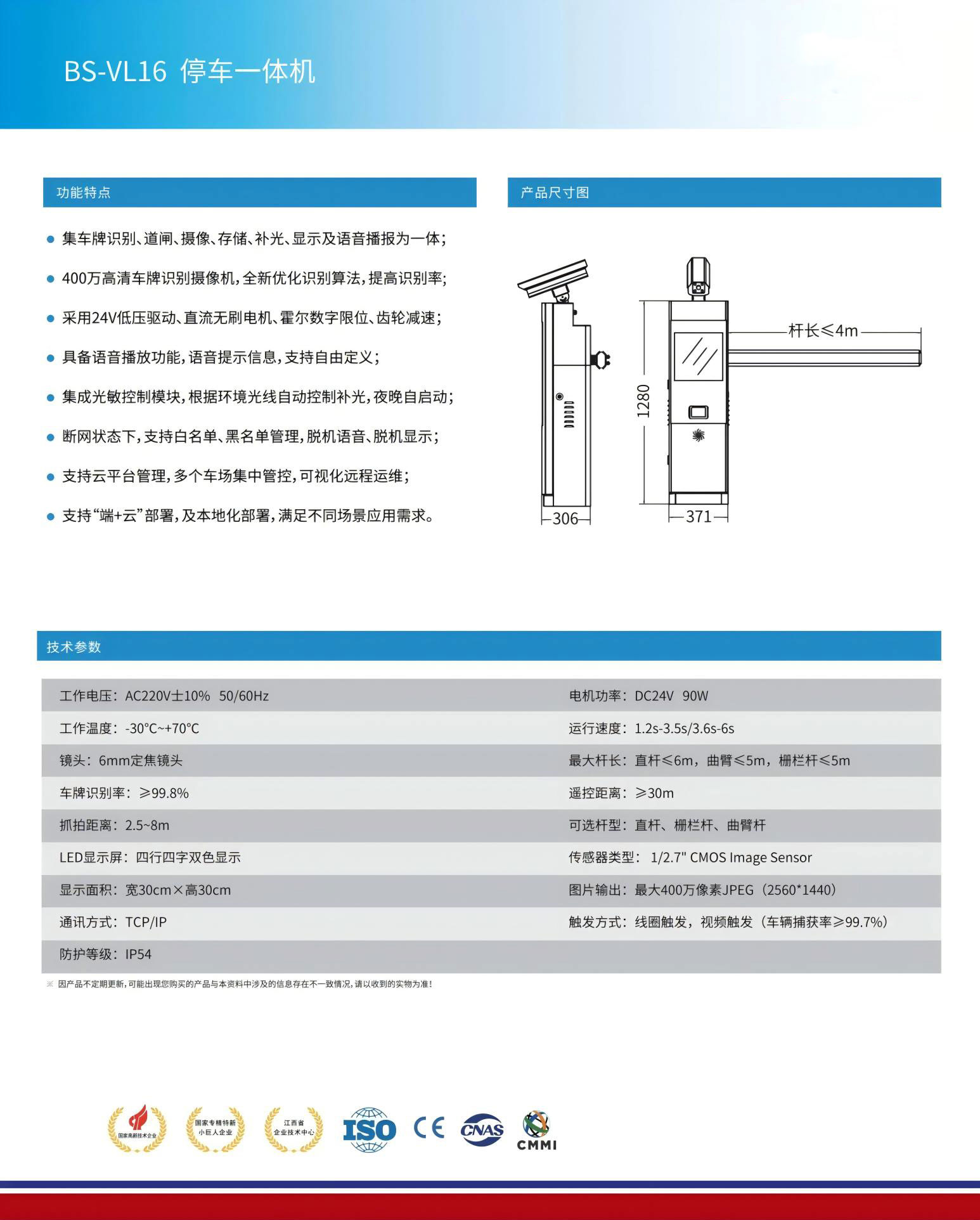 ●集車牌識別、道閘、攝像、存儲、補光、顯示及語音播報為一體;