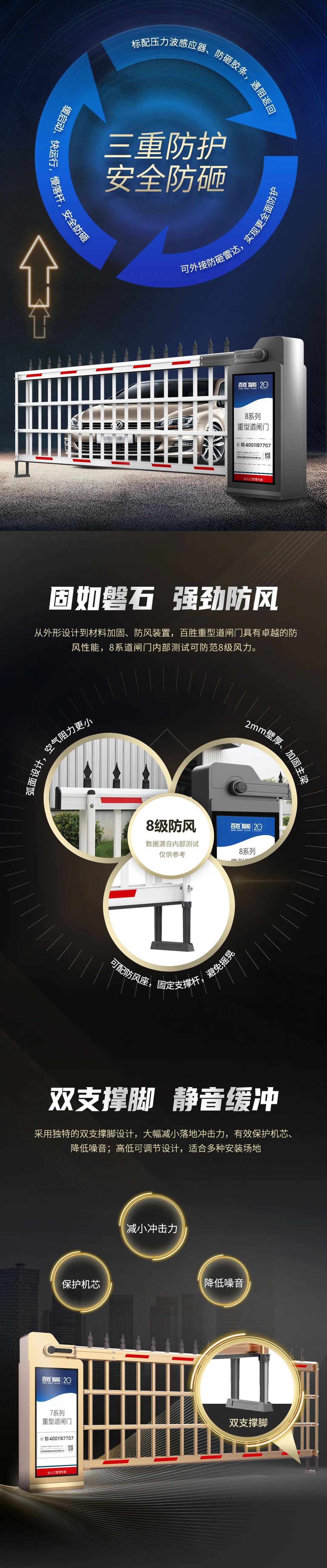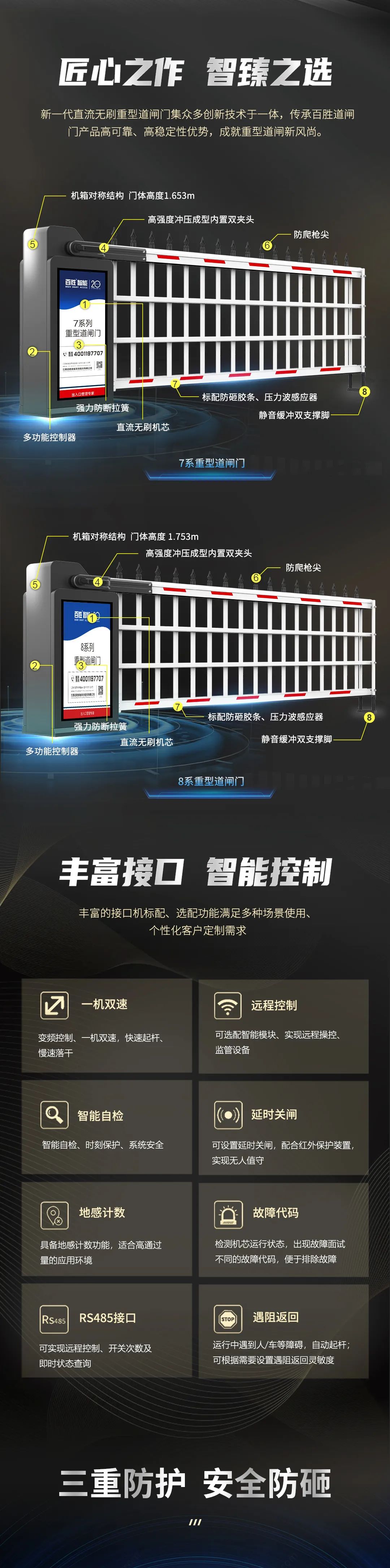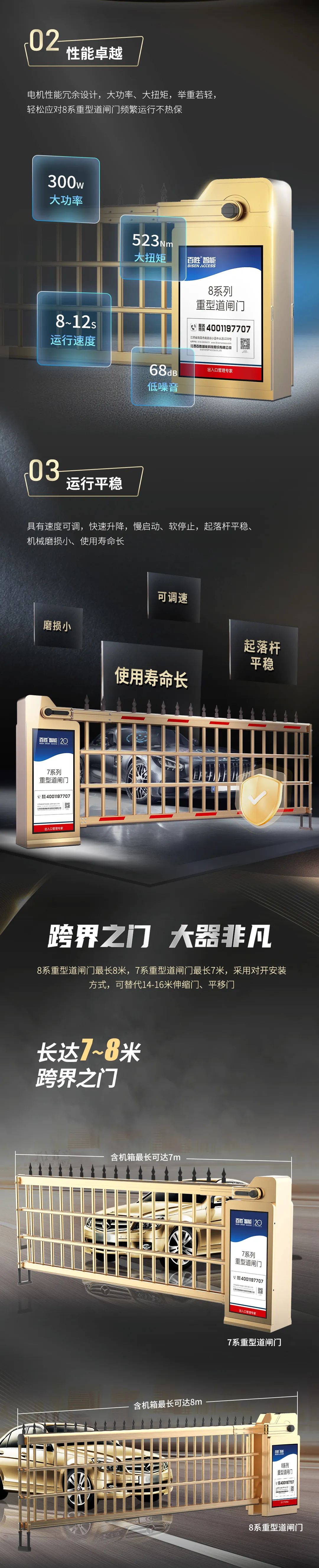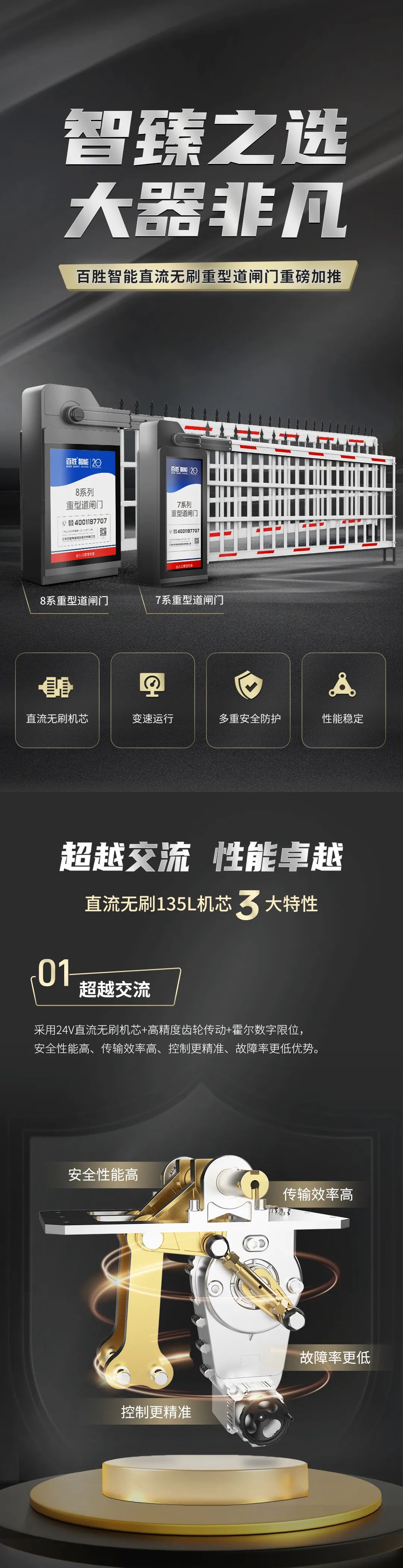 新一代直流無刷重型道閘門集眾多創(chuàng)新技術(shù)于一體,傳承百勝道閘門產(chǎn)品高可靠、高穩(wěn)定性優(yōu)勢,成就重型道閘新風(fēng)尚。